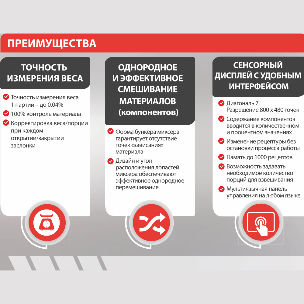 Каждый компонент перед смешиванием взвешивается с помощью тензодатчиков с классом точности - СЗ, что соответствует комбинированной погрешности +/- 0,02% - Простота управления